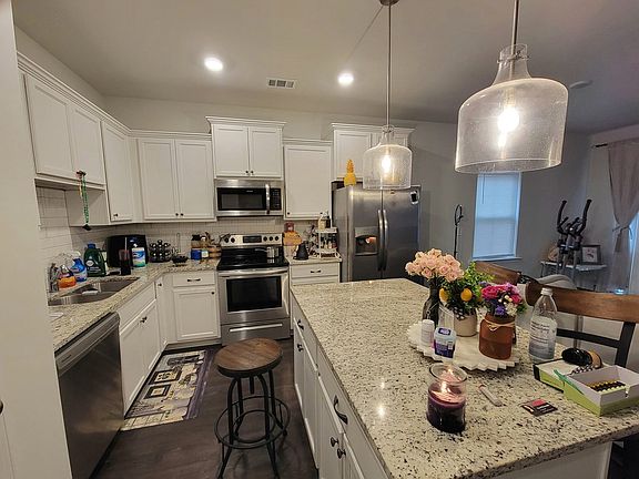 Gorgeous END UNIT townhome! Nestled between Harris Trail & hwy144. Being sold by first owner in excellent condition. Amazing upgrades- ss kitchen appliances, washer & dryer, blinds & curtains for windows/sliding door, and SHOWSTOPPER wall mounted 85" 4k tv in LR! Electric fireplace with glass rock and space heater capability. Main floor and wet areas have LVP flooring. Open kitchen has large island with breakfast bar and makes this floorplan great for entertaining. Humble patio/yard area is great for fresh air & watching the pond behind. Lush carpet upstairs not walked on with shoes! Master is first room at top and divided from the others by master bathroom. Closet racks upgraded to shelf & drawer system. Laundry closet is just down the hall, across from common bath, with bedrooms 2&3 at the end. Attic insulated with spray foam. HVAC utilizes fresh-air-intake. Remainder of 2-10 home warranty can be transferred. Exterior is HOA maintained. 1 car garage, 2 car driveway, guest parking.