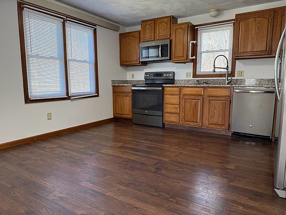 Welcome to this adorable 3-bedroom, 2-bathroom single-family home located in a quiet cul-de-sac. With 1,064 sq/ft of living space and a finished basement, this home offers plenty of room for comfortable living. The main level features three good-sized bedrooms and two full bathrooms, ensuring space and privacy for everyone. The eat-in kitchen boasts stunning granite countertops and sleek stainless steel appliances, perfect for preparing meals and entertaining guests. Throughout the home, you'll find luxury plank vinyl flooring that adds a touch of elegance and is easy to maintain. Step outside to enjoy the newly finished back deck with durable composite deckingideal for relaxing or hosting outdoor gatherings. The walk-out basement provides easy access to the large yard, offering a perfect space for outdoor activities. Additional features include washer/dryer hookups in the basement for added convenience. The home is situated in a peaceful neighborhood, making it the ideal retreat for anyone seeking tranquility with easy access to nearby amenities. Tenant is responsible for all utilities electric (heat), water and sewer. Tenant is responsible for lawn care and snow removal. Applicants must have a credit score of 650 or higher, and monthly income must be at least 3x the rent. First, last, and security deposit required. Ranch style single famuly home on .47 acres.