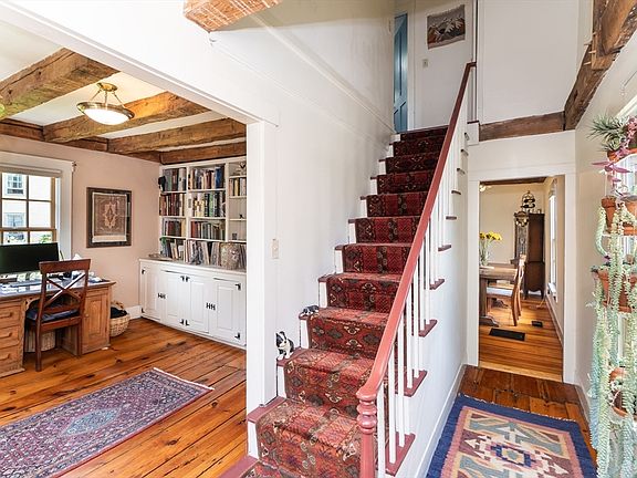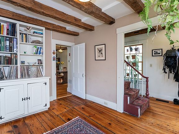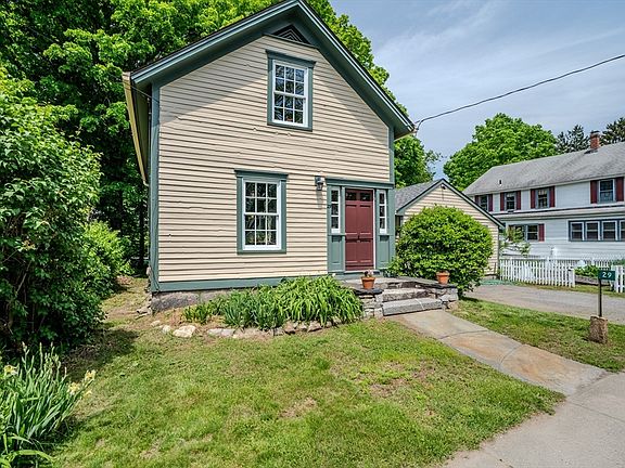This historic 1830 Colonial offers a unique blend of modern conveniences and old-world charm. Located on the common, this picturesque home boasts a deck that overlooks a beautiful conservation area, perfect for enjoying the peaceful surroundings. Inside, wide pine and fir floors add to the character of the home, while a garage with storage provides ample space for all your belongings. With public water and sewer, oil heat, and two mini splits for added comfort, this home has everything you need for modern living. The newer roof (2021) ensures peace of mind, while raised bed gardens offer the opportunity to indulge your green thumb. Inside, you'll find updated electric and plumbing, along with a cherry kitchen with walk in pantry that is both functional and stylish. First floor laundry a plus!! With five rooms, two bedrooms, and 1.5 baths, this charming colonial is the perfect place to call home. Minutes to major routes and area schools - a rare find in todays marketplace.