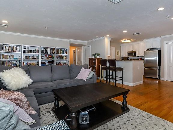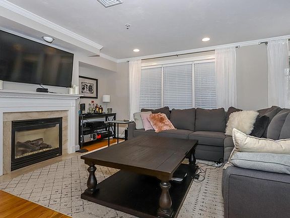 Beautiful & Spacious 1st Floor Condo at Grover Estates. Enjoy single level living in this commuters dream location that is just steps away from the town center & train and ideal back of the building unit placement in the complex that faces trees and the Canton Public Library. Features & amenities include a granite & stainless kitchen with under cabinet lighting & a breakfast bar that open to a large living room / dining room combo w/ gas fireplace and slider to private patio, an oversize master suite w/ walk in closet & private full bath w/ double sinks & large shower stall, parking for 3 cars including 2 garage spaces - one underground & one detached, laundry in unit, recessed lights, programmable smart thermostat, central air, all appliances included, pets allowed and a condo fee that also includes heat & water/sewer.