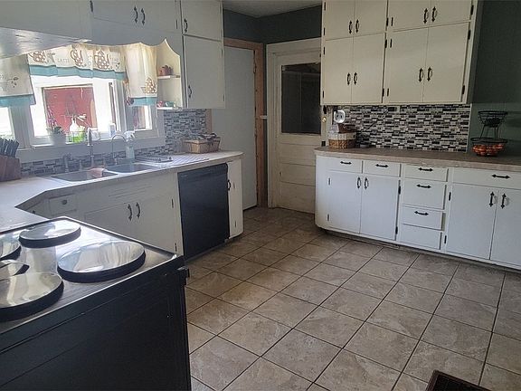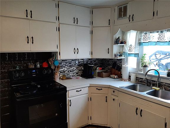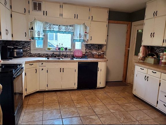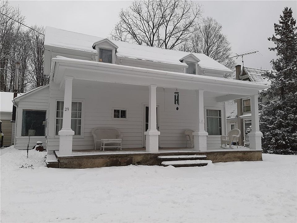 Large 4 bedroom, 2 full bath home with open front porch located on 0.34 acre lot near Main Street. Large size, eat-in kitchen with plenty of cabinets and recent tile floor leads to dining room with wood burning stove. All appliances stay. Spacious front living room with stone fireplace against rich tone, wood sided wall with built-ins for storage. First floor bedroom with full bath and laundry room. Bonus room with many possibilities. Second level features three bedrooms with closets and full bath. Hardwood floors throughout. Walk in unfinished attic which could be finished. Fenced in back yard that backs up to wooded area. Two car attached garage with electric, wood burning stove, and workshop area. Also radon mitigation system. Many possibilities.