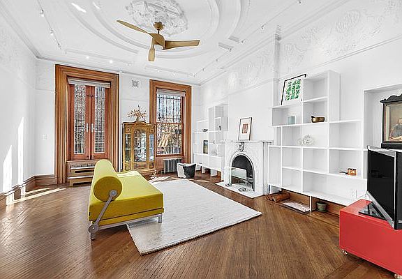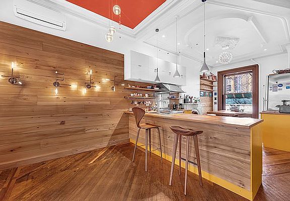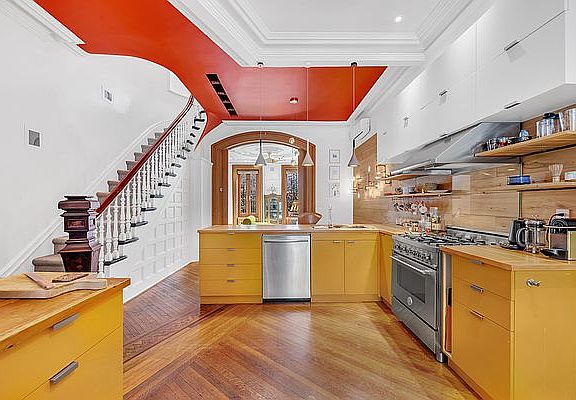 Come home to a colorful piece of remixed history in the heart of Fort Greene, Brooklyn! This turn of the century brownstone, dating back to 1899, is nestled next to Fort Greene Park and is surrounded by vibrant cultural hubs, making it a prime location for those seeking a unique blend of historic charm and modern convenience. An artistic, contemporary spin on the classic design gives this home a lively personality, filled with joy and fun. As you step inside, you'll be transported back in time by the original details that have been meticulously preserved, including the hardwood floors, Lincrusta plaster details, Italianate marble fireplaces with stone mantels, and a carved balustrade, contrasted with high-design contemporary chandeliers, industrial fixtures and delightful, bright colors in every room. This stunning triplex has been gut renovated to offer the perfect combination of classic and contemporary living, pairing an ultra modern gourmet kitchen with classical archways, pocket doors, moldings, medallions, niches and carvings throughout. With three full floors, you'll have ample space to create your dream home. Three bedrooms are perfectly sized, providing large, comfortable living spaces that are filled with natural light. A top floor artists' studio makes for a lofty fourth bedroom with natural wood beamed ceilings and heritage wide plank pine floors. Enter up the front stoop, through tall carved double doors, into an entry foyer where you're greeted by a central open kitchen with dining area. A Bertazzoni gas range is surrounded by custom cabinets which also enclose the Bosch dishwasher below butcher block countertops with lots of prep space. Double pocket doors lead through a high molded archway into the living room, which has a wood burning fireplace, very high ceilings, a wall of built-in bookcases and two tall windows overlooking the rear garden. A private outdoor deck is accessible through French doors from the living room. The deck runs the entire width of the house, and it overlooks the landscaped garden below. Beautifully curated plants, flowers, trees, stones and a babbling fountain and koi pond provide a natural layer of peace. As you climb the staircase to the second floor, you'll note the built-in video displays contrasted with a beaux arts niche at the second floor landing. This floor has two bedrooms, one at either end of the house, each with its own Bisazza mosaic tiled bath. Bedrooms have good closet space, high ceilings, unique chandeliers and hardwood floors. One more flight up reveals a traditional bedroom on the front of the house with the loft-like artist studio on the rear, which also has a laundry room and very colorful tile bathroom. As an architectural epiphany, glass has been inlaid within the center hallway floors on each level to allow natural light from the top floor skylight to penetrate the center of this elegant house, adding a distinctive lighting element not found in other brownstones. The prime Fort Greene location is very close to public transportation, iconic American brands such as Apple Store, Whole Foods, and Target, as well as cinemas and a diverse range of neighborhood stores. Fort Greene Park, with its tennis courts and picturesque tree-lined streets, is just a stone's throw away, offering a plethora of outdoor recreational activities and events. Living in this historic district means being surrounded by an eclectic choice of fabulous restaurants, adding a gourmet touch to your everyday life. The combination of the historic charm of the brownstone, the cultural richness of the neighborhood, and the convenience of modern amenities make this property the rarest of opportunities for you to call home.