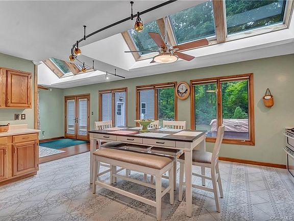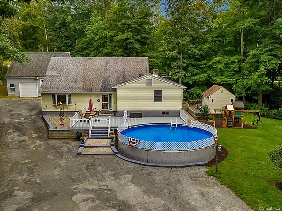 This owner-built home sits on a serene and secluded property. Step in to the main living spaces, where new Cali bamboo flooring runs throughout the living and dining rooms. The kitchen and dining room feature an abundance of light from oversized windows, cathedral ceiling with skylights, and Pella French doors leading to the back patio. Installed one year ago, the cathedral skylights with solar remote shades create a passive solar dwelling. Enjoy time in the open kitchen, which is spacious enough for a center island and eat-in table. Down the hall, the master ensuite is separated from additional bedrooms. The basement is almost fully finished, and just awaits your finishing touches! There is space for an additional living room, laundry, and game room. Work from home in privacy, with options to set up your office in the basement or upstairs bedroom. Outdoors, the property has a staycation feel with a large deck, paver patio, pool, playscape with rubberized landscaping, game space, hot tub area, and tranquil brook, all set on beautiful grounds. The heated garage is just six years old and is a mechanics dream with an open ceiling and a loft. Multiple heat sources, including pellet or wood stove and oil heat and hot water. Located on a semi-private road, close to restaurants, and an easy commute to Hartford or Providence. Call today for your private showing.