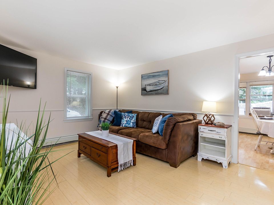 Set back off the road & cute as a button! Move right into this cozy Ranch style home offering easy one floor living featuring 3 bedrooms, 1 bathroom, full basement and a walk-up attic for potential expansion. Light & bright living room opens to the spacious kitchen/dining with exterior access to the newer back deck for summer enjoyment. New gas heating system, as well as fresh interior and exterior paint. Conveniently located near Snake Pond with a large beach for residents to spread out & enjoy. The roped off swimming area is great for young kids and the calm waters are perfect for paddle boarding and kayaking. Passing Title V on file. Buyer/Buyers agent to verify all information contained herein.