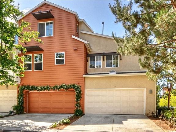 Welcome to a spacious Ladera Ranch Sutter's Mill 3 Bedroom + Loft home with two car driveway! Ground level open floorplan features beautiful Travertine flooring, tall baseboards, window casings, high ceilings, and many light filled windows lending the property to the feel of a single family home. The living room is highlighted by a fireplace and is open to the eat-at island kitchen. The ground level also has a generous dining area and a convenient half bath. The master retreat is highlighted by a balcony, walk in closet, and a beautiful ensuite bathroom with soaking tub and separate shower with glass enclosure. The stairway in the master leads to a loft with a vaulted ceiling, travertine floors, and numerous windows that offer picturesque hills views; perfect for a home office or media room. There are two other bedrooms upstairs that share a Jack and Jill bathroom. In addition to the two car driveway it also offers an attached garage with direct access to the kitchen. . This unit is just a short walk away from the Celestial Plunge pool and playground, and is in close proximity to the sport courts, dog parks and paseo.