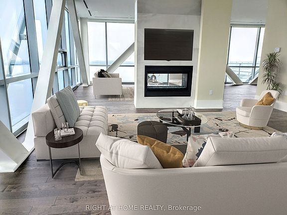 WORLD-CLASS PENTHOUSE! V.I.P EXECUTIVE RENTAL! RARE WATERFRONT TROPHY-SUITE WITH STAR-QUALITY! Truly, a one-of-a-kind, creme de la creme residence offering the ultimate in luxury by the lake. Arguably, the most spectacular, condo rental in Toronto! Sprawling 4000 Sq. Ft, 3 views, 10-ft ceilings, gallery foyer for your art & treasures, 4 spacious bedrooms, 3 spa baths, 42-ft Great Room, double-sided fireplace, dream kitchen, 32-ft breakfast balcony, storage galore, top Miele/Sub Zero appliances, ensuite gym area! Designer details: mood lighting, stylish chandeliers, motorized blinds, neutral colours. Stunning modern architecture, steel beams, wraparound windows, awash with natural light. Perfect elevation - front and centre location, in the middle of the glass arch connecting twin tower. Unobstructed, panoramic, SE vistas of the sparkling lake, plus jaw-dropping night views of Toronto's dazzling skyline to the North. Massive 60-ft, 900 SQ. Ft. sundeck, your private urban oasis for de-stressing & watching the boats glide by. Entertainer's delight! Terrace is fully equipped with a king-size chef's BBQ, rolling umbrellas, dining table & chairs, stylish loungers. Can accommodate 50-100 guests for glam, alfresco cocktail parties & celebrating life's milestones. Ideal for sports celebrity, media mogul, business notable, or a corporate transfer who wants the best! Live the dream in Toronto's glittering Harbourfront. Enjoy acres of park, miles of beaches & trails. Stroll to everything that matters. Near nature, cafes, Micheline fine- dining, groceries, LCBO, posh shops, hotels, festivals, theatres, ferry docks, Island Airport and 5 min. from Bay Street & the bustling financial core. First-class building amenities: 24-hr security, fantastic concierges, elegant party room, resort-style pool, fitness centre & more. Don't miss this one. Perfection is hard to find. This magnifient condo sky-mansion is as good as it gets! Beyond awesome! Floor Plan & Tour attached.