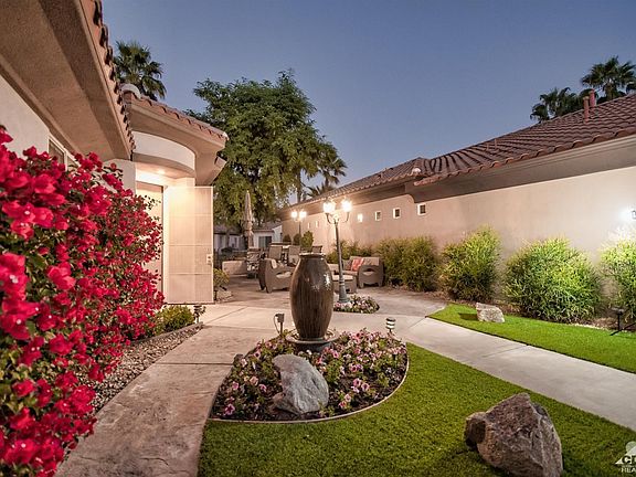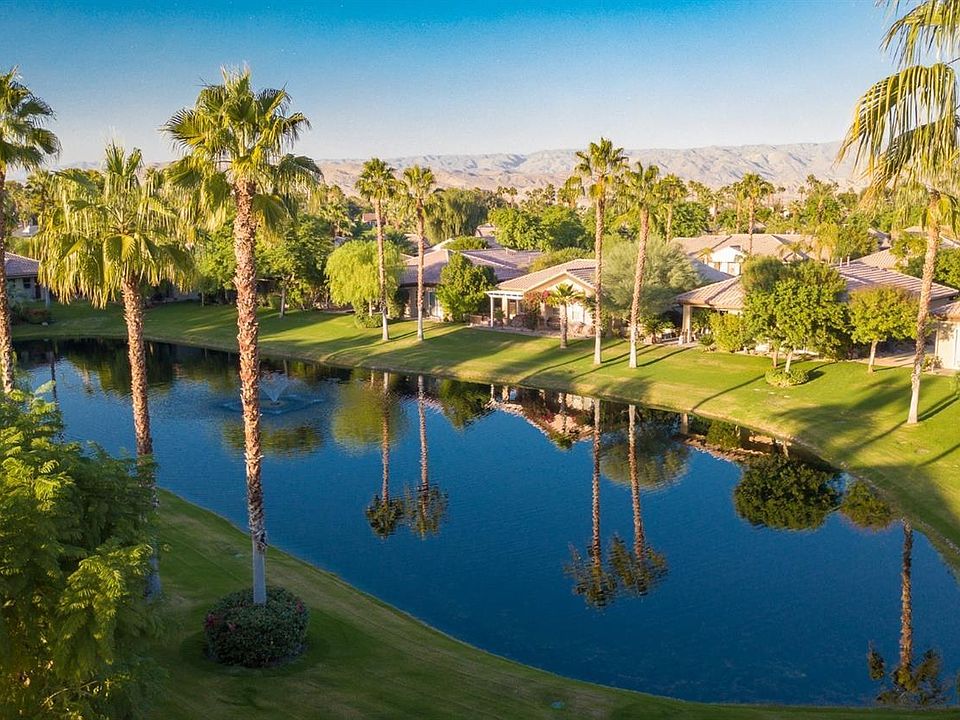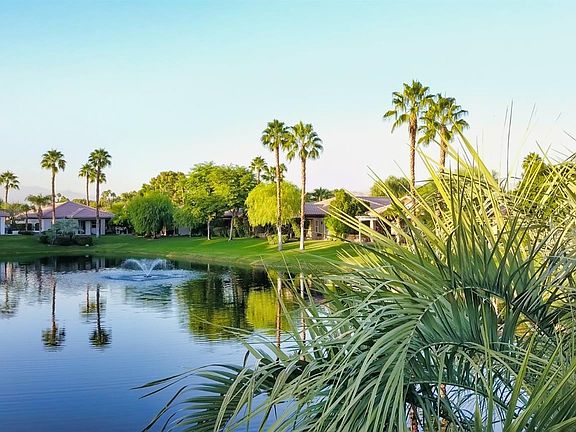 Lakefront and newly updated inside and out in Mission Hills Country Club! Plus Low HOA's include a social/fitness and tennis membership- for the ultimate HOA value! A private courtyard entry opens to your own tropical outdoor entertaining oasis with custom BBQ island w/bar top & seating or gather around the gas fire pit to enjoy the sun, dramatic sunsets, mountain and lake views. Open and bright interior is perfect for entertaining while enjoying beautiful lakefront views that pour into the living spaces. Wet bar with access to the living room back patio adds to the desired open flow of indoor/outdoor living. Oversized master suite retreat w/ adjoining office, media room or library w/ private patio and fountain. Super low land lease only $45/month. Mission Hills is a gate guarded community with 3 private golf courses, 27 tennis courts, croquet courts, world class fitness center and an active social membership. Resort style or private living, your choice, you've got it all here