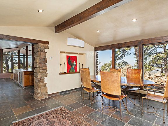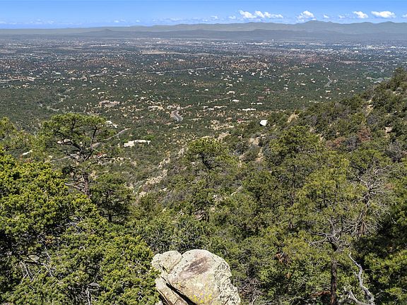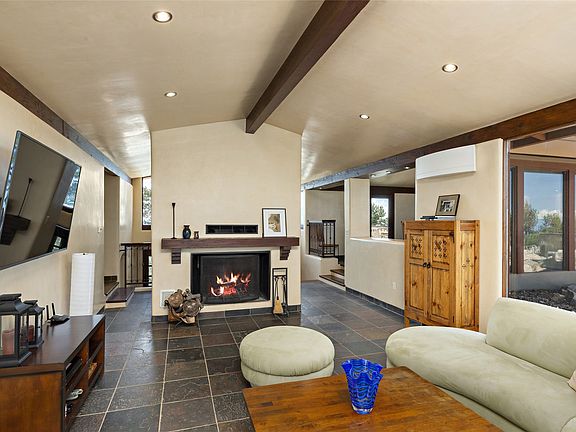 Hidden high above the city of Santa Fe’s sparkling lights just off of Old Santa Fe Trail in the established Overlook II subdivision, this special home takes advantage of spectacular top-of-the-world city and mountain views in all directions. This custom block/frame and stucco home sit on approximately 9 unencumbered and dramatic vista view acres. Exquisitely constructed and remodeled in a passive solar design, every attention to detail has been considered - from the siting of the home to the hand-plastered walls and slate tile floors. This three-bedroom home has a separate and sumptuous owner's suite with a private patio and a sumptuous bathroom complete with a soaking tub and steam shower. The large living area envelopes the backdrop of the mountain-scape and sky. A nearby formal dining and kitchen area offers a free and easy experience for those looking to entertain complete with top-of-the-line stainless steel appliances. A treetop perched patio is accessible off of the kitchen area. A large sunroom off the kitchen offers another seasonal dining option or flex room with tall evergreens surrounding the home for quiet contemplation and unobstructed views. Comforts such as newly installed mini-split heating and AC systems are in place throughout the home, with lovely fireplaces in almost every room. Propane-assisted solar panels heat the water/radiant heat for the home. This is a wonderful place to play, explore, and be in perfect unison with nature.
