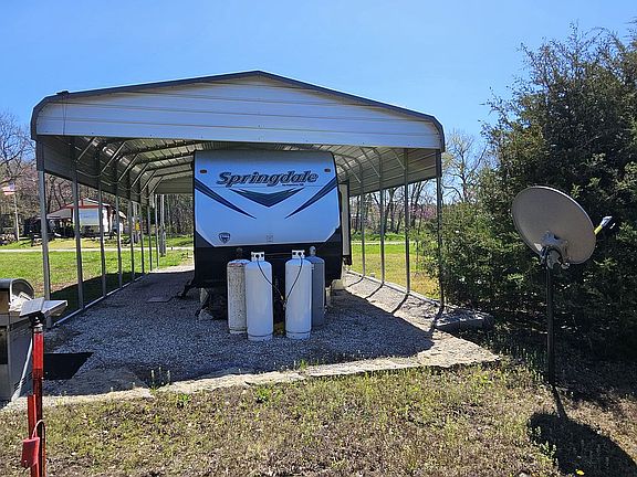 3 camping lots with 2018 Keystone Springdale 38FL Travel Trailer. Sleeps 8 people with 2 pop outs. Full size refrigerator and propane stove/oven. Electric fire place and propane heat. Dual A/C, new A/C installed 2022 in bedroom. Wired for satellite TV and satellite internet. 35x22 foot metal carport covering entire trailer with plenty of space in front for entertaining, bbq, hot tub. 2019 Derksen Tuff Shed with electricity inside and out; 9x12 foot. Property wired for 200 amp service. 1500 gallon water and sewer holding tanks. 3 camping lots for total of 12,000 sqft of space. Fenced in garden plots. 4-100 lb propane tanks and propane bbq grill included. 3rd empty lot comes with utility pole with room for boat/vehicle storage.