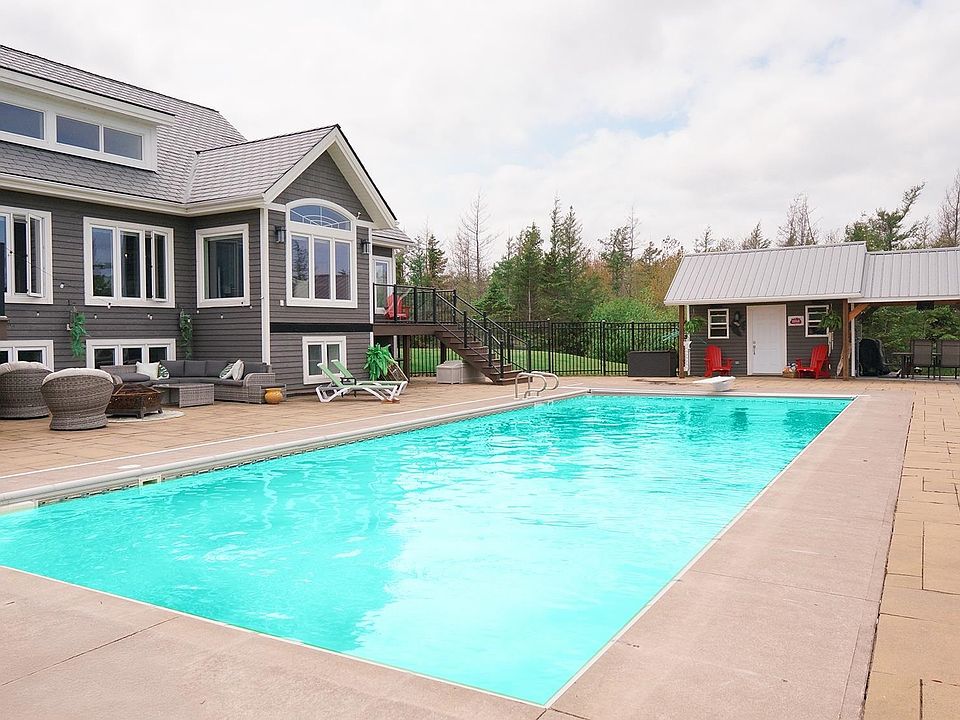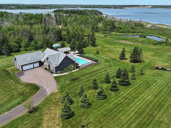 (VIDEO - Click on the Multi-Media Link) [PRE-INSPECTED] [18 ACRES WATERFRONT | POTENIAL FOR WATERFRONT GUEST COTTAGE(S) | PRIVATE LANEWAY TO WATER | HEATED POOL & HOT TUB | POND] This stunning custom-built raised rancher sits on over 18 acres with more than 700 feet of prime waterfront on Winter Bay, offering luxury, privacy, and year-round adventure. Enjoy a heated saltwater inground pool with a hot tub, glass railings, composite decking, and an expanded pool house complete with a bathroom and changing room, all surrounded by professional landscaping and a fully fenced patio area. The home features vaulted ceilings, massive windows with panoramic bay views, Hunter ceiling fans, custom blinds, imported lighting from Ontario, and a propane fireplace with rockwork and built-in shelving. The bright open-concept layout includes a grand entry, sunroom, dining area, kitchen, and living room, with access to an upper deck leading to the pool. The large master retreat impresses with vaulted ceilings, private deck, two walk-in closets, and a spa-like ensuite. Additional main-floor perks include a custom home office and guest bath. Downstairs, the fully finished lower level includes a great room, two bedrooms, a den, full bath, and ample storage. The triple garage is heated and cooled, and the home comes with a wired-in generator, updated flooring, and the potential to install your own private dock. A newly added laneway leads you to the waterfront where a potential building site awaitsperfect for a guest house or additional cottages that could provide rental income. Walking trails, a scenic pond, and proximity to sandy beaches and a popular seafood restaurant complete this coastal masterpiece you wont want to miss. Due to the complexities of some floor plans, purchasers are requested to verify all measurements, age, and features before making an offer.