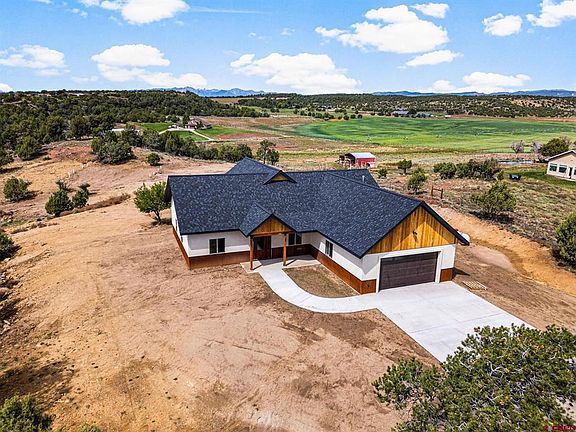 This stunning new construction one-story residence encompasses 1,935 sf of thoughtfully designed living space, showcasing a seamless open floor plan perfect for modern living. The home is ideally located on a 3-acre lot just off of County Road 510 between Durango and Bayfield. As you step inside, you’re greeted by a nice foyer leading into the either the office or large great room with vaulted ceilings and lots of natural light. Great views of the La Plata Mountains can been seen to the west from the oversized sliding glass doors and the gas fireplace with stone surround adds ambience to the space. The kitchen is nicely appointed with granite counters, stainless steel appliances, alder cabinets with soft close drawers and a generously sized island that's ideal for both meal prep and casual dining. The split floor plan provides privacy for the primary suite with en-suite bathroom with double sinks, a large tiled walk-in shower with glass door and a huge walk-in closet. The two guest bedrooms and the second full bath are on the opposite side of the home. Off the kitchen is the laundry room with extra room for pantry storage and access to the oversized two car garage. Finishes include hardwood oak flooring in the living areas, tile shower surrounds and tile floors in the bathrooms, stained wood trim and doors, forced air heat with A/C, and a high efficiency on demand water heater. There is a covered patio off of the great room to enjoy the cool Colorado nights and take in the great views. Call today to see this great home!