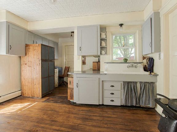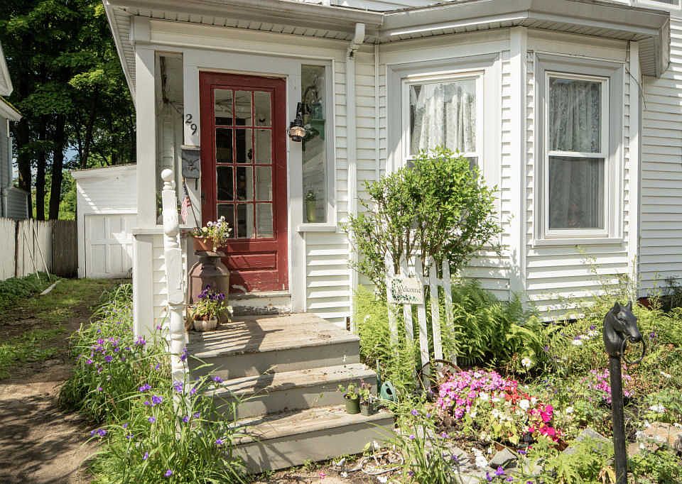 Walk to parks and town from this sunny turn of the century gem near Main St Rochester. Well maintained and full of charming historic details at every turn, including pristine hard wood staircase, rare original crown moulding woodwork around all doors and windows, antique french doors to dining room, bright bay window, high ceilings, tin ceiling in kitchen, antique door knobs and fixtures throughout. You will be greeted with an enchanting flower garden and light filled window paneled entrance way & porch. Large kitchen features farmers sink, wood cabinets and eat-in area. 2 bedrooms and large full bath upstairs. Lots of storage throughout home plus two options for laundry either in kitchen or cellar. Antique barn garage and cellar. This is a truly delightful home close to all the services, shopping, and amenities of thriving Rochester.