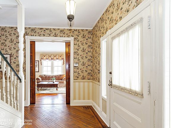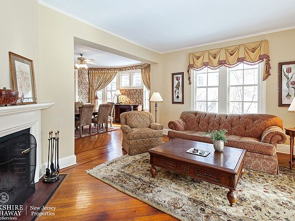 Lovely and spacious Queen Anne Victorian set on landscaped half acre just one block from Glen Ridge town center, NY bus and trains. Original details include open front porch, gracious entry hall, beautiful hardwood floors, sunroom with built-in window seats, leaded glass windows, fireplaces (one working, one decorative) in living and dining rooms. Great room addition with laundry room and powder room opens off cook's kitchen with Wolf range. French doors lead to large screened back porch and deck. Partly finished basement with rec room, playroom, and storage. HMS Home Warranty included.