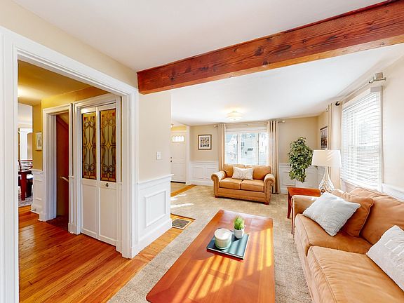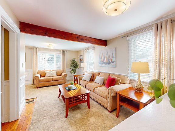 Find sanctuary in Quincy's seaside secret, Squantum. Scenic skyline & water views define this charming community. Expanded Cape w/ 3 bedrooms. Pride of ownership w/ significant upgrades over the years. Hardwood floors, newer Anderson windows, decorative molding & recessed lighting throughout. Bright eat-in kitchen with ample cabinetry, stone counters & ss appliances.Tiled mudroom w/access to backyard and patio. Family room with custom built-ins. Formal dining room with wood burning fireplace. Updated bathroom on 1st floor with tumbled marble flooring, wainscoting, & crown molding. Two sizable bedrooms upstairs and large primary bedroom and walk-in closet. Renovated main bathroom and laundry room. Finished basement including full bathroom. Attached garage and basement storage. Close proximity to beaches, minutes from Marina Bay restaurants, boardwalk, shops, and dog park as well as Squantum Point Park with hiking trails. Easy access to highway and public transportation.