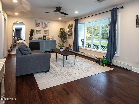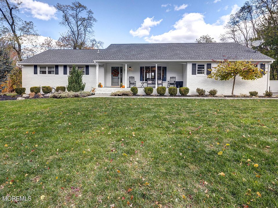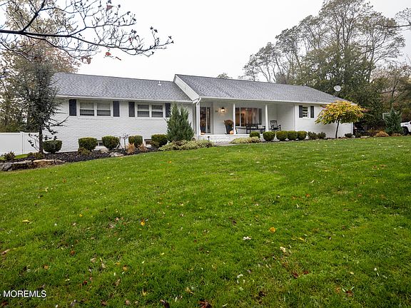 Introducing a turn key ranch in desirable Holmdel, perfect for single floor living. Enjoy a cup of coffee on the large porch with all new landscaping. Inside you are greeted with an open floor plan with an abundance of windows. The kitchen is beautiful with an original wood high vaulted ceiling, newer countertops, appliances, backsplash, and cabinets with plenty of space. 3 bedrooms with an en suite primary. Downstairs offers an additional 1200 square feet finished basement with a bathroom. There is laundry and additional unfinished space for storage. The park like backyard is fully fenced in with newer landscaping, patio, and a deck that is great for entertaining. Newly renovated barn is perfect for storage or a general workshop space. Perfect location for commuters. Come see it today!