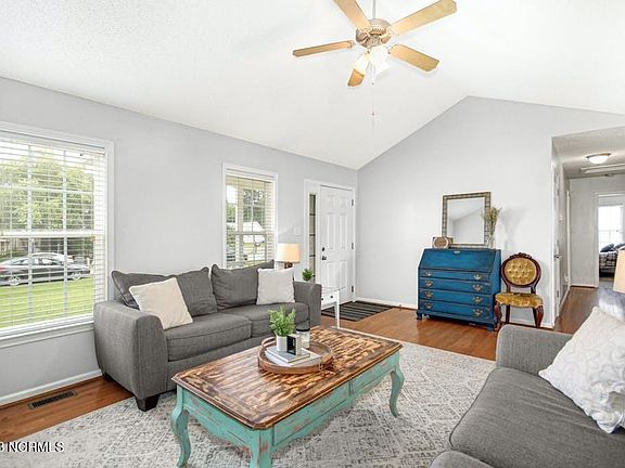 IMMACULATE, Move In Ready~Per seller:NEW hot water heater '23 and NEW HVAC in '21~LUSH landscaping Welcomes you~Covered front porch and side porch~HARDWOOD floors accent the VAULTED ceiling family room, COZY gas log fireplace~Kitchen boasts PANTRY, eat @ bar~Dining area has access to deck & backyard~Primary bedroom features VAULTED ceiling, walk in closet, Private BAth~2 other bedrooms & another FULL hall bath~WALK IN laundry rm~SERENE & TRANQUIL backyard~Attached & Detached storage~WELCOME HOME