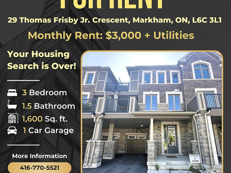 Address: 29 Thomas Frisby Jr. Crescent, Markham, ON, L6C 3L1Monthly Rent: $3,000 + UtilitiesAvailable: ImmediatelySquare Feet: 1,600Size: 3 Bed | 1.5 BathProperty Type: Freehold TownhouseParking: Included