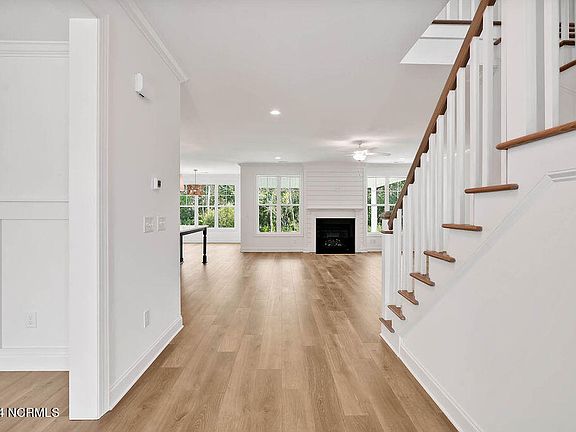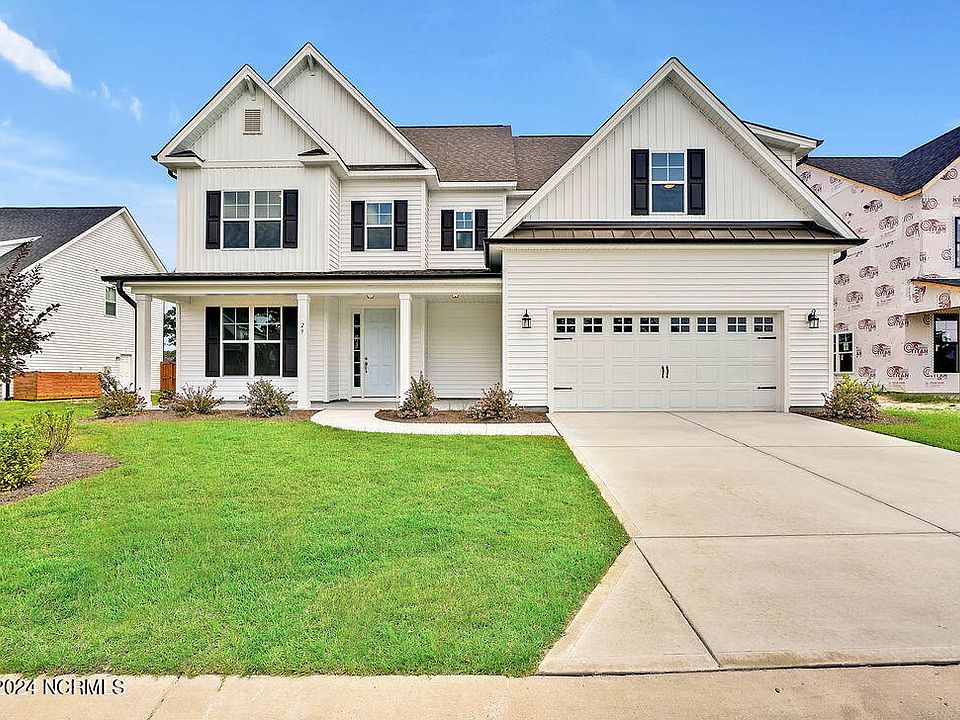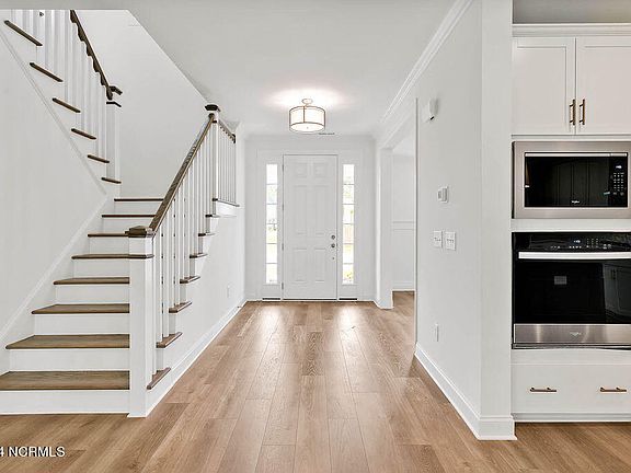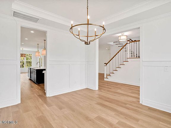 Move-in today into the Masonboro by American Homesmith, nestled within The Sanctuary at Forest Sound's final phase. As you approach, a generous covered front porch beckons, setting the stage for what lies beyond. This two-story, 4-bedroom, 4-bathroom home is adorned with distinctive stone accents and a stylish metal roof that graces the garage entry. Inside, an open-concept layout reveals itself, featuring a formal dining room that effortlessly flows into a spacious kitchen overlooking the welcoming family room and breakfast area. Every facet of this home has been meticulously designed. The kitchen takes center stage, showcasing a large center island, quartz countertops, an elegant tile backsplash, and high-end stainless steel appliances, including a natural gas cooktop with a sleek hood vent, as well as a wall oven and microwave, a perfect setting for hosting gatherings and creating culinary delights. The bright and airy family room is a true focal point, boasting a charming shiplap fireplace with natural gas logs. It graciously opens onto a 250 sq ft covered porch, where you can relish outdoor relaxation and entertainment. The first floor is thoughtfully completed with a guest suite and a convenient mudroom, directly accessible from the garage. Moving upstairs, ample space awaits. The master suite is an oasis of luxury, featuring a trey ceiling, two sinks, a spacious walk-in shower, and an expansive walk-in closet adorned with custom wood shelving. Two additional bedrooms, another bathroom, a substantial rec room that could double as a fifth bedroom with an attached bathroom, and a dedicated laundry room complete the upper level. This home promises both comfort and convenience, with features including a sodded and irrigated yard, wide plank laminate flooring throughout the first-floor living areas, and a high-efficiency natural gas tankless water heater. The community's future plans include a proposed boat storage area, making it a haven for water enthusiasts.
