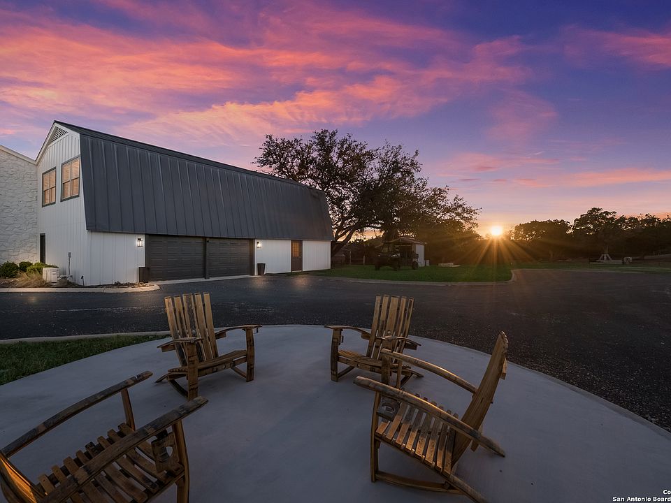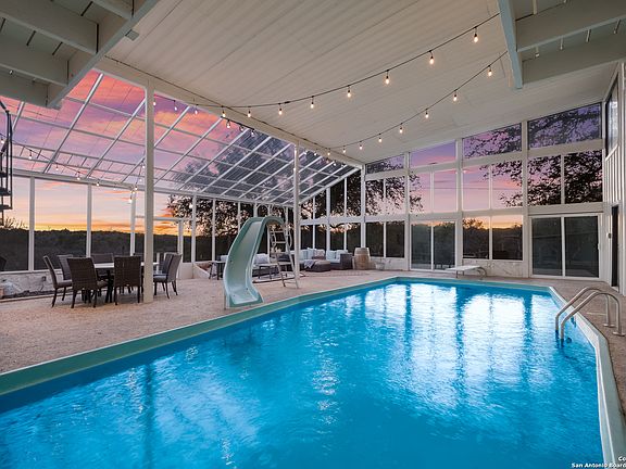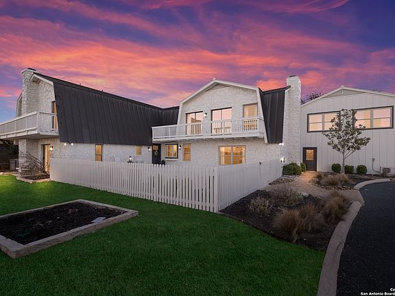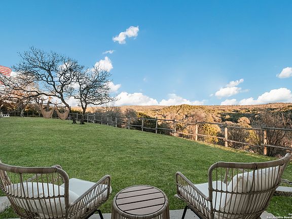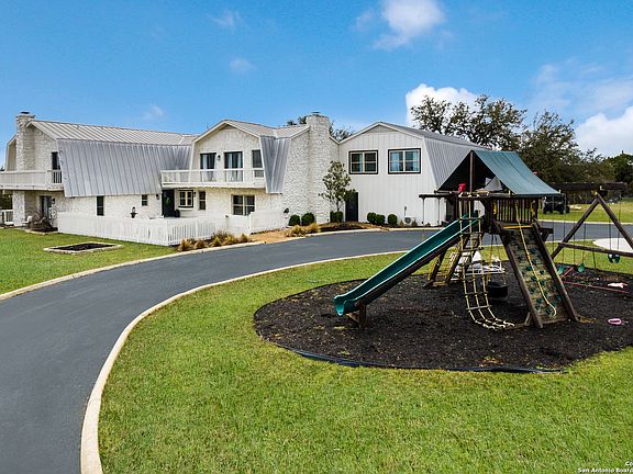 Spectacular 10 Acre Hill Country Ranch Estate offers the Ultimate Hill Country Views and Privacy. Impeccably Updated Modern Farmhouse Style Home, a Sparkling Pool Surrounded by Windows, and is just minutes from Downtown Boerne! Elegant Circular Driveway greets you and as you step into this special home, you will fall in love with the fresh paint inside and out, Hardwood flooring and Tile (NO CARPET!), New Lighting and Plumbing Fixtures throughout, Brick Accents and Flooring in Entry, Hallway, Dining Room, and Family Room, and 3 Bathroom Remodels. No detail has been forgotten in this gorgeous remodel, and you will love relaxing or entertaining in your Family Room with Sweeping Ceilings, Walls of Windows Bringing the Hill Country Views in, Charming Stone Fireplace and in your Gourmet Kitchen complete with New GE Smudge Proof Stainless Steel kitchen appliances including an air fryer oven, Freshly Painted Navy Cabinets with Gold Hardware, Striking Gold +White Herringbone Backsplash opening to an Inviting Dining Room with Brick Accents. Retreat to your Downstairs Master Suite boasting Stone Fireplace, a Free-Standing Soaking tub, Custom Tiled Shower, New Vanities, and a Walk-In closet boasting built-in's and your Washer and Dryer. Security meets Privacy with Two Entry Gates - Recently Painted and Electric Keypads for your Convenience. Key Updates and Features include Electrical completely redone, Spray in foam insulation added throughout the home, all siding replaced with board and batten siding, a Metal Roof, All new drapery/rods/rings throughout, and concrete slab poured outside of the pool area. Upstairs Apartment area or 5th Bedroom offers a kitchenette, full bathroom, walk-in closet, and a new mini-split, A/C/heat unit. Oversized 3 car garage with workshop and framed out above with electrical making it simple to add on to the home. This 10+ acre ranch is home to goats, 2 donkeys, 3 sheep, 2 ram, and there are water troughs/feeders/etc in the barn area. Welcome home to your hill country heaven that's only minutes from Boerne and is zoned to stellar Boerne ISD!