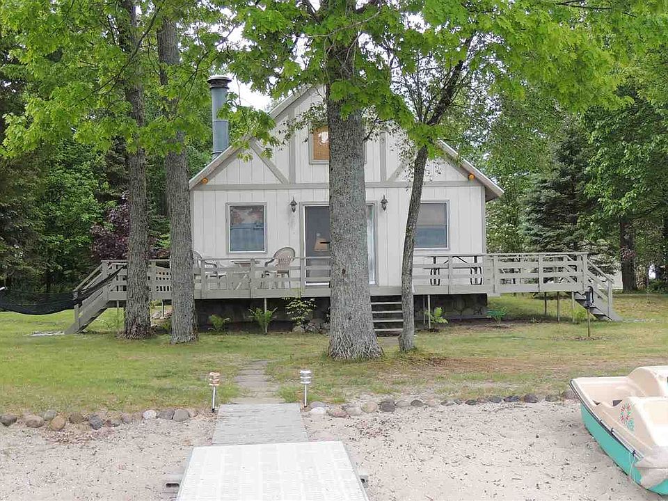 HIGGINS LAKEFRONT: Breathtaking views from this cozy Higgins Lake Treasure Island paradise cottage. Large loft area/3rd bedroom with lake views. This property has one of the most beautifully maintained sandy beaches on the lake!! Outdoor shower and shed. Brand new Craftlander dock. This is a turn key listing as it comes totally furnished! Just a few short steps from your cottage to the lake makes this the perfect vacation home.