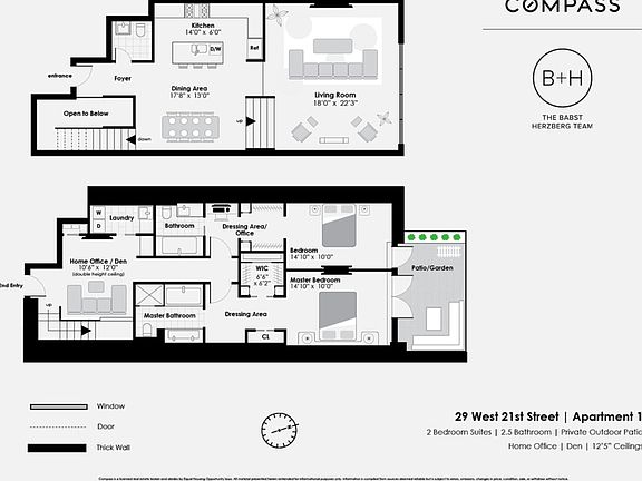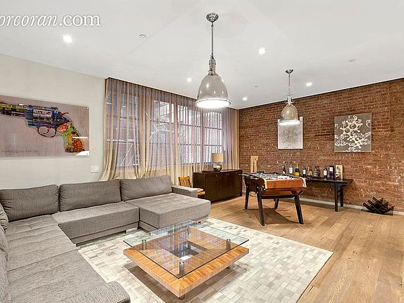 Strictly ballroom. This dramatic duplex loft is entered directly from the building lobby and opens to a grandly-proportioned living area with extraordinarily high ceilings. An open kitchen offers top-of-the-line appliances from Bosch and Sub-zero, tastefully incorporated into custom cabinetry. Wide-planked floors of smoked Austrian oak stretch to oversized matte-black steel casement windows, and continue panelling exposed brick walls beneath adjustable recessed cove lighting. Think: Christmas in Aspen. Downstairs, spacious and serene bedrooms each include elegant en-suite baths and generous closet space. Radiant floor heat throughout in bedrooms and baths. Each bedroom also opens to a secret back patio. With high brick walls, this is the perfect outdoor refuge, 12 months a year. Powder room for guests. Private laundry room with deep sink. Dual-zone central air conditioning. 24-hour remote monitoring and package delivery is coordinated via virtual lobby attendant, offering convenience and security with the utmost of discretion. No board approval. Sorry, no pets! Available Immediately.
