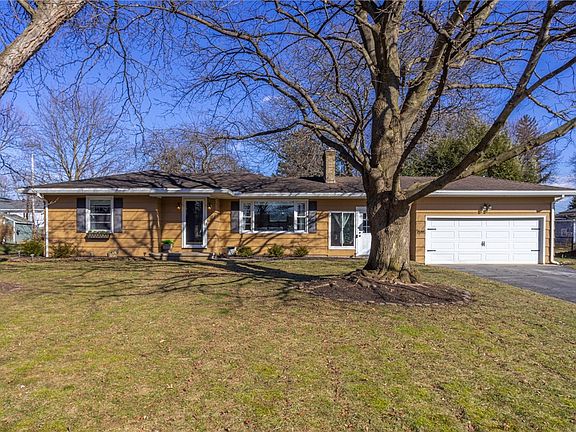 Welcome to this charming Ranch home located in the GATES CHILI School District! This well-maintained property features 2 spacious bedrooms and 1 bath on the main floor. The partially finished basement provides even more potential for extra living space or storage. Nestled on a quiet street and surrounded by mature trees, the park-like setting offers privacy and tranquility, making it the perfect retreat with its fenced in backyard. Enjoy the bright and airy family room with an abundance of windows. Cozy up by the gas fireplace or take advantage of the updated white kitchen, perfect for cooking and entertaining. Hardwood floors run throughout the home, adding warmth and character. The large 2-car garage offers additional convenience. Don't miss your chance to own this lovely home—schedule a visit today!