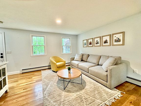 Welcome home to this quintessential New England Cape style home at the end of a short quiet street. The moment you step in the door you will feel the warmth with the natural light streaming in the windows and flow of the open floor plan. The first floor has 2 living spaces for flexibility. One has a lovely wall to wall book case and cabinetry. The large eat in kitchen has a french door to your outdoor patio. A full bathroom with washer and dryer complete the first floor.The second floor has a large primary bedroom, a second bedroom, and an office currently being used as a bedroom. The bath on the second floor is awaiting your personal touches. The basement has a large finished area for many uses. The utility side also contains plenty of storage space. The large backyard is fenced in and has a lovely patio for enjoying the outdoors. The exterior has had a new roof 2016, new siding and windows 2022. Easy access to walking trails, town center and highways.