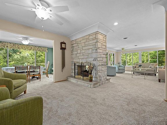 This spacious, all-brick ranch home features a breathtaking living room with a two-sided fireplace, and walls filled with windows for expansive views of the private, park-like back yard. You'll also appreciate the abundance of natural light in the cozy hearth room and the inviting sunroom. The eat-in kitchen includes a breakfast nook, new windows, and plenty of cabinet and counter space. Three nice-sized bedrooms, two full baths, and a convenient 3'x5' utility closet, complete the main level. The walkout lower level offers a generous 21'x23' family room with a woodburning fireplace, access to a roomy back patio space, a bonus room (currently used as a bedroom), a laundry room, and a 9'x10' concrete storm shelter/storage room! The home includes a whole house generator, and the perfect man cave/she shed out back with electricity and AC! OPEN HOUSE Aug 24, 12-2PM. Buyer to verify all MLS data including but not limited to square feet, measurements, features, exemptions/taxes, schools, etc. Additional Rooms: Sun Room
