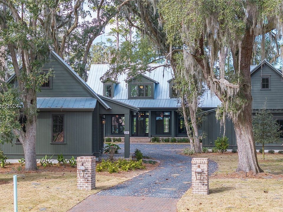 New construction in Moreland, this six-bedroom, six full- and two half-bath Moreland Point residence sits on more than acre of marsh front land with a main house, guest cottage, and two carriage houses. Surrounded by expansive live oaks and native pines, the 6,325-square-foot property is reminiscent of a historic lodge with rustic, refined, top quality detailing throughout. It overlooks marsh to the rear and parkland to the front and is convenient to water-based adventure on Lake Bales, the new 9-hole Crossroads golf course, and dining, fitness, pool, and more in Moreland Village.