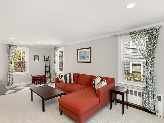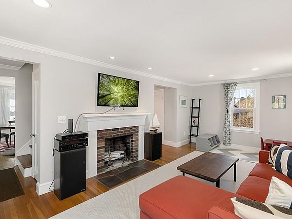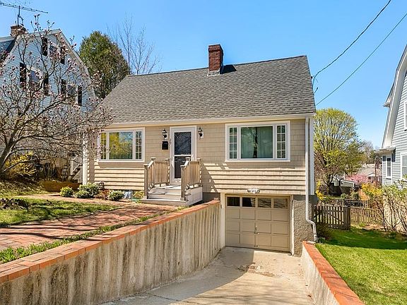 Welcome to this lovely updated dormered cape with open floor plan and hardwood floors throughout. This home is situated on a quiet dead end street with access to the Charles River path. Recent exterior updates including new roof, cedar shingles, insulation, windows, doors, and gutters. In the spacious living room, large windows overlook the front yard and a working wood-burning fireplace. Updated kitchen with granite counter-tops, cherry cabinets, and stainless steel appliances and peninsula with bar seating. Kitchen opens to the dining room which features large front window. Upstairs you'll find a bright and airy master bedroom and an equally sized second bedroom. Both bathrooms have been updated and feature clean pedestal sinks and wainscoting. Outside there is a large fenced-in yard with a new bluestone patio. Attached garage with built-in storage and bonus square-footage in unfinished basement. Friendly neighborhood with easy access trails, bike paths, and Russo's produce market.