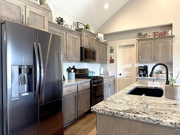 Perfect blend of small-town charm and convenience in the picturesque town of Linwood, Kansas. Short drive from Lawrence, Tonganoxie, and Bonner Springs with close access to I-70 and other highways. This beautiful 5-bedroom, 3-full bath ranch-style home with a walkout basement offers the perfect blend of spaciousness, comfort, and modern design. Nestled on a serene cul-de-sac, this property is a true gem that combines luxury living with natural beauty. Open-concept layout seamlessly connects the living, dining, and kitchen areas. Well-appointed kitchen with granite countertops, stainless steel appliances, and an expansive island, a haven for culinary enthusiasts and a hub for family gatherings. The main floor features three generously sized bedrooms, each with ample closet space and large windows. The primary suite is a retreat, complete with an ensuite bath featuring a walk-in shower and large walk-in closet. The finished walkout basement is versatile space that offers endless possibilities. With two additional bedrooms, a full bath, and a spacious recreation area, this level is ideal for accommodating guests, setting up a home office, or creating the ultimate entertainment zone. Doors open to the backyard, where you'll find a covered patio area and deck for outdoor relaxation and gatherings. Enjoy the convenience of a dedicated laundry room, a three-car garage, and ample storage space throughout the home.
