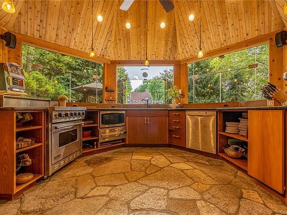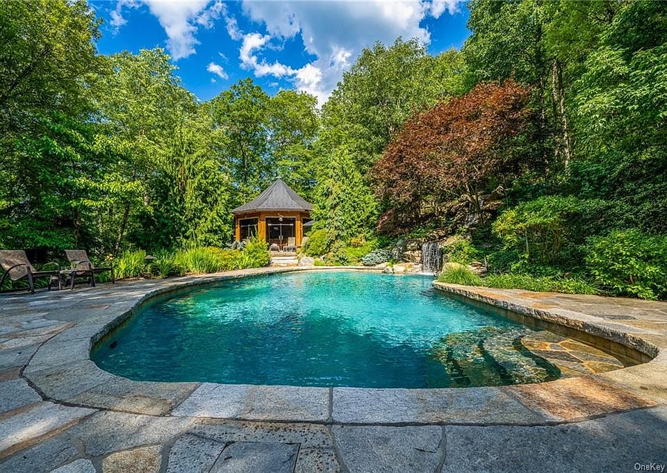 Tree Top Oasis. Privately tucked away at the top of the hill on almost 4 acres with salted water Pool and luxurious Cabana. The retreat you have been searching for with unmatched outdoor living space. The Cabana has full Kitchen, Steam Room, Sauna, and Full Bath, laundry and cooper bar. Over 2000 sq feet of finished outdoor space with additional outdoor kitchen, BBQ, Firepit and Hot Tub. The Chalet style house is open on all sides to wrap around decking. Professional Kitchen with top quality appliances. Living Room, Family room with stone fireplace and Dining Room. Light filled yet grounded by the natural wood to truly enhance the tree house feeling. First floor office or guest room. Master bedroom suite, and two additional bedroom with hall bath on top floor. Just 50 miles from NYC. Enjoy horseback riding, boating, hiking, biking, tennis and golf just minutes away.