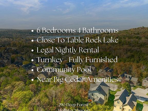 Welcome to this incredible 6-bedroom home in a highly sought-after, proven nightly rental development near Table Rock Lake and Big Cedar! This turnkey property is designed for high occupancy and guest satisfaction, with spacious accommodations that comfortably sleep large groups, making it a fantastic investment opportunity. Located just minutes from the lake and the amenities of Big Cedar, guests can enjoy outdoor adventures, lake activities, and local attractions with ease. This home features an open-concept layout, well-appointed kitchen, and multiple gathering spaces, perfect for entertaining and relaxation. Don't miss out on this rare chance to own a thriving nightly rental in an unbeatable location!