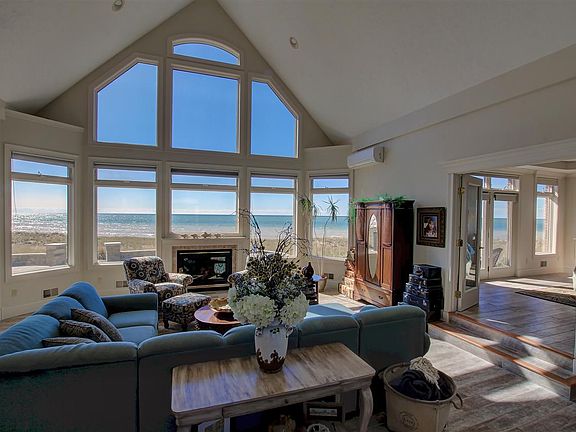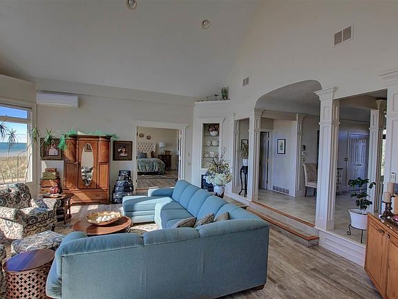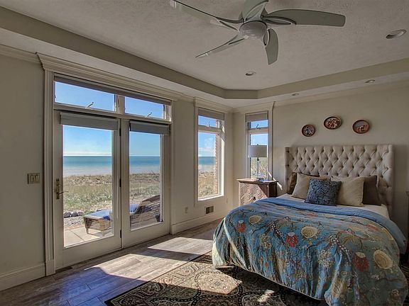 Beautiful LAKE MICHIGAN home on Dunes Drive in Manistee! Four bedrooms and 4.5 baths in this quality, custom built home w panoramic views of Lake Michigan, the Manistee Lighthouse & beautiful sandy shoreline. The home's design is centered around entertaining w open floor plan, tons of windows, cathedral ceilings & gas fireplace in the living room. Kitchen has maple cabinets, two sinks, an island w seating & a walk-in butler's pantry. The main floor master suite has coffered ceilings, a large walk-in closet w/ window & screened French doors opening to the private patio overlooking the lake. The master bath has his & her vanities, tiled floors, glass block shower & connects to laundry room. Downstairs you'll find a family room, bedroom with egress, plus a theater room w/ bar area. A newly designed outdoor entertainment area has a patio extending across the entire beachside of the home w integrated firepit & fountain for rinsing the sand off your feet! The stone line pathway leads to a second firepit area on the beach.
