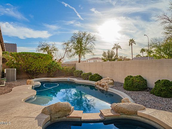 Recently remodeled home that is an entertainer's paradise. Resort like backyard with a salt water pool and heated spa surrounded by lush landscaping and a built in grill. New flooring throughout, 4'' baseboards, and door frames. Brand new A/C installed (Oct 2024) with a 5 year manufacturer warranty. Cherry kitchen cabinets with easy glide drawers and built in trash cans with granite counters and stainless steel appliances. Double door pantry with lots of storage space. Large secondary bedrooms. Hall bath has newly remodeled bathtub with surround. Master bath has a brand new vanity and light fixtures. This home is freshly painted, clean and move in ready. Conveniently located a few miles to downtown Gilbert, Chandler, San Tan Village, 202, and 101.