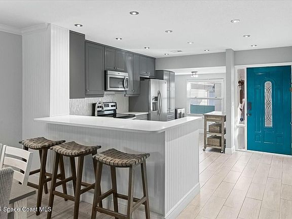 Modern Coastal Elegance - Steps from the Beach. This beautifully renovated beachside retreat blends modern elegance with coastal charm. Hurricane impact windows/sliding doors 2023, and a hurricane-rated garage door offer security and peace of mind. The updated kitchen features quartz counters, grey cabinetry, a farmhouse sink, decorative backsplash, and LED lighting. Coastal tile and vinyl plank flooring flow throughout, accented by plantation shutters, crown molding, and ships lathe wainscoting. The primary suite boasts a private balcony, custom closet cabinetry, and a spa-like bath with a sliding barn door, double faucets, and a walk-in tile shower. Guest bedroom also ensuite. Freshly painted interiors, three renovated baths, and an open floor plan make this home move-in ready. Enjoy a two-car garage, guest parking, a heated community pool, and easy walking access to beaches, restaurants, and Paradise Beach Park. With a 2020 A/C and 2018 roof, this is Florida living at its best!