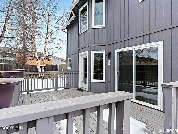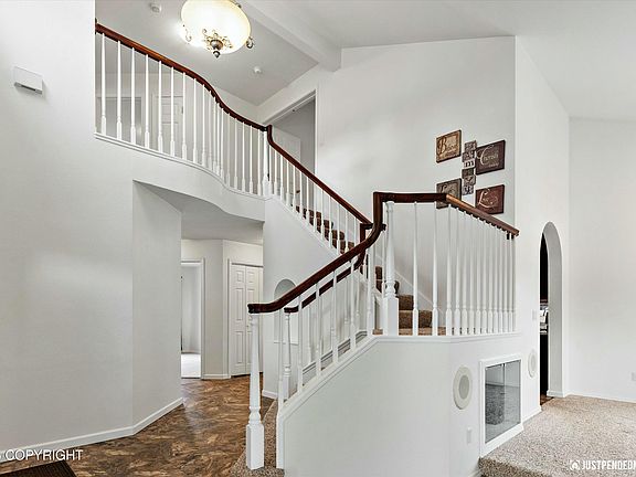 Beautifully maintained Eastside 2-story that is truly a pleasure to show. Vaulted ceilings, triple pane windows, young roof, and modern interior finishes. All baths updated in 2024 w/new vanities, lights, fixtures, and enclosures. Lovely kitchen w/quartz patterned solid surface counters, ss appl, 5 burner gas range, bar seating & colorful track/pendants. Main floor secondary bedroom and bath.Upstairs features a spacious primary suite with double doors, a walk-in closet and an adjoining modern bath with a corner soaker tub, double vanity and separate shower - all with barn door slider hardware. The driveway was expanded and rebuilt in 2021 to accommodate up to 6 vehicles. The roof is young, installed in 2015 with 50-year shingles. New roof vents were added in 2025 to prevent ice damming. Awesome location 5 mins from JBER, quick access to the east side trail systems and shopping centers. No HOA. mountain views...super clean and move-in ready!