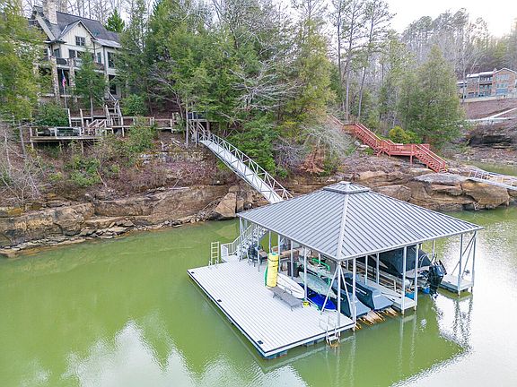 This lakefront haven boasts year-round water access and comes equipped with an all-aluminum dock, including a boat lift, a swim platform, and a covered seating area - perfect for lake enthusiasts. The property's ample covered storage is ideal for safeguarding your outdoor gear and lake toys.
