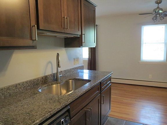 Clean and bright 2 bedroom, 1.5 bath unit on top floor. Hardwood floors in living areas except ceramic tile in kitchen and bathrooms. Updated cabinets in kitchen and granite counter tops. Laundry room is conveniently located in same building. There is a rentable garden area at the complex as well as an inground pool, basketball court, and playground. There is also a private storage locker. 2 built in wall air conditioners. Rent includes heat, hot water, and gas for cooking. Tenant must have good credit and references. Pet considered for well behaved animal. Available immediately for 1+ year lease. Owner will consider longer term lease. Smoking not allowed in unit.