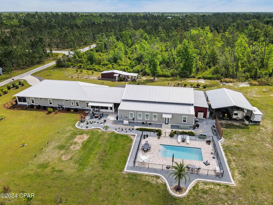 UNDER CONTRACT- ACCEPTING BACK UP OFFERS - COASTAL DREAM ESTATE WITH RESORT-STYLE AMENITIES - JUST 20 MINUTES FROM MEXICO BEACH! Experience the perfect blend of luxury, comfort, and coastal living in this exceptional estate nestled on nearly 9 acres in Wewahitchka, FL - just 20 minutes from Mexico Beach and 25 minutes from Port St. Joe. This custom home offers a resort lifestyle. Enjoy the coastal life without the salt air maintenance that comes with living right on the coast. Embrace the peace, privacy (dead-end road), and versatility this property provides. Designed for seamless relaxation, entertainment, and multigenerational living, this exceptional property combines the comforts of modern living with the beauty and space of a private estate. The main residence offers 2,600 sq ft of elegant living space with 3 bedrooms and 2 baths, featuring smart home technology, large mud room and laundry room, screened front and back porches, and a whole home generator for ultimate peace of mind. A separate 1,000 sq ft private guest bungalow - complete with full kitchen, bedroom, bath, and living area makes the perfect private suite for extended family, guests, or independent multigenerational living. Outdoors, indulge in resort-style amenities with lush landscaping and lighting including a 28'x14' inground heated & chilled saltwater pool- perfect for outdoor entertaining. For car enthusiasts there is a 40'x60' luxury 6 car garage/workshop-heated and cooled, a 400 sq ft loft office wired for tv/internet, a 28'x14' air conditioned she-shed, and a 30'x40' pole barn. ADDITIONAL HIGHLIGHTS INCLUDE: climate-controlled 10'x10' pet suite with automatic door & Invisible Fence, climate controlled 28'x12' storage room with laundry hookups for the bungalow, 30'x12' outdoor storage room attached to main garage, app-controlled irrigation, underground rainwater drainage, Ring security system, app-controlled irrigated raised garden beds, and a carport for two cars. Beach days within reach-without the salt air wear-and-tear. This is more than a home - it is a DESTINATION built for family, freedom, and the future. Must see in person - pictures do not do this place justice!
