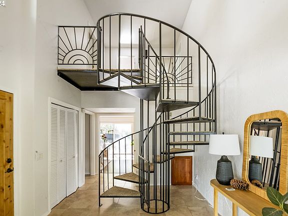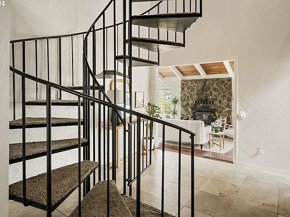 Set at the top of Gresham Butte, this lovely home has been meticulously updated and maintained, while still retaining that retro 70s swagger. On the main floor, a circular floor plan leads you through the entrance with cool custom railing and spiral staircase to a jaw-dropper of a living room: vaulted ceilings, wood burning fireplace with stone surround and hearth, and rows of big windows to welcome in the natural light - HUBBA HUBBA. The dining room adjoins with a huge open kitchen, with eat-in island, newer stainless steel appliances, and seemingly endless cabinet and counter space. There’s a large back deck, offering the feeling of being tucked away in the forest. Up a few stairs, a bonus rumpus room (with laundry area and loft for storage) leads through sliding doors to a fantastic deck atop the 2-car garage - this is a spacious, sunny space that’s primed for BBQs and social gatherings with your buddies. Three bedrooms reside on the top floor. The primary bedroom has vaulted ceilings, and a sweet ensuite bath, complete with double vanities and a big ol' luxurious soaking tub! Updates include newer roof, new siding, exterior/interior paint, landscaping, and appliances...let's just say that there’s been some love and care invested over the years. And the oversized garage could easily be your new bespoke workshop, too. Close enough to amenities but far enough away from the bustle of the crowds to breathe in that country air, this is a fabulous turnkey home surrounded by green spaces and ready to adapt to your lifestyle.