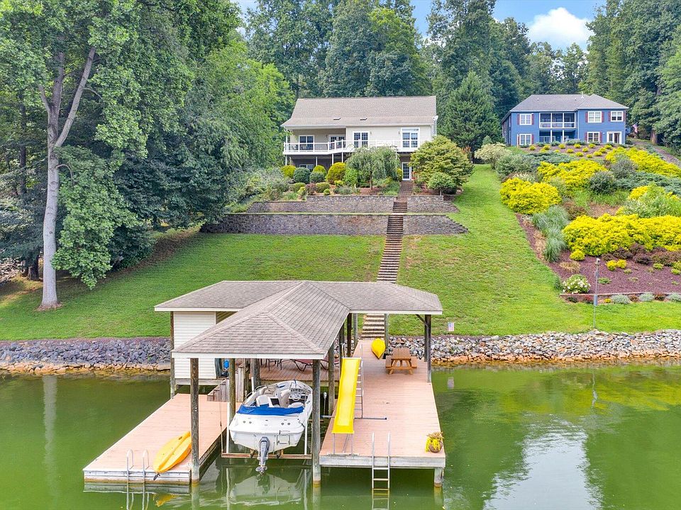 This lovely 4 BA , 3 BA Contemporary home is perfectly situated on 1.3 acres in a park-like setting. Entry/L features the Master Suite, 2 guest BR & Guest BA, Open floor plan, living room w/gas FP, Dining area, eat-in kitchen, breakfast area, spacious deck with glass railings to enjoy the lovely lake views, front porch to enjoy quiet evenings, paved driveway, & 2 car garage. The lower includes the family room w/gas FP, guest BR & BA, laundry Room, 2nd kitchen, tons of storage, spacious patio. The dock features a single boat slip, boat house & floater. Deep water, perfect for all lake activities. Additional patio for for entertaining friends and family. Paved driveway plus an extra driveway on the side of the home, & a storage shed.
