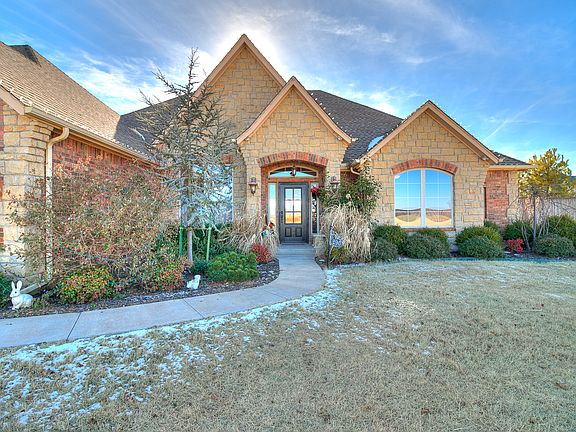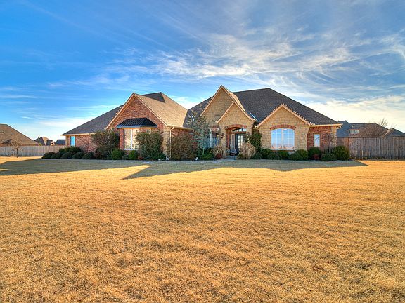 Enter through the covered front porch to your home flanked by a study w/built-ins & open dining rm in this stunning charmer on 3/4 acres in Goldsby! A corner stone fireplace adds warmth to the living rm w/expansive picture windows. A breakfast nook provides space for dining/homework along w/the eat-at bar. Glazed cabinets accent the granite counters, stone back-splash, & SS appliances! The island is a treat w/it's own prep sink & contrasting colors giving you that "pop" in the center of the room! The lg master retreat will spoil you w/trey ceilings, walk-in, dbl sinks, jetted tub & separate shower. Two more bedrooms w/Jack & Jill bath provide versatility. Bonus rm w/wet bar makes the perfect theater. Laundry rm boasts a dog shower AND a sink w/plenty of space for a 2nd fridge! The backyard is your personal oasis w/an over-sized covered patio, fire pit,& pool. Two geothermal units & 2 tankless water heaters along w/ foam insulation and low E windows keep this home extremely efficient!