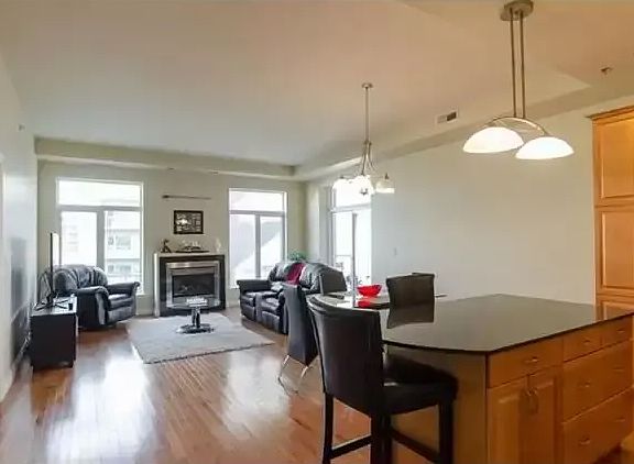 Beautiful maple cabinets, dark granite & stainless steel appliances adorn the kitchen. Large island with matching granite and pendant lighting transition kitchen to the open living/dining area. A tiled gas fireplace is flanked by 7ft windows which afford views from every angle. The jewel in the spacious master is the large 4pc ensuite w/ heated tile floor plus walk in closet