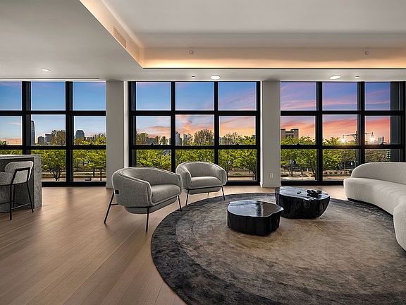 The entire apartment has been tastefully reimagined by architect Sarah Witkin to maximize the extraordinary light throughout the apartment. Open kitchen sports an enormous honed tundra grey marble waterfall island, raked white sand marble tile backsplash, and custom gloss cabinetry, and includes an elegant breakfast banquette situated by the window. Living room includes a separate bar with platinum quartzite stone slab counters and polished stainless steel backsplash. Master bathroom features honed white sand marble slab vanity, fixtures by Dornbracht, double faucets, rainshower, and deep soaking tub. Secondary baths outfitted with stone porcelain tile and Kohler fixtures. The entire apartment has been outfitted with sleek knife-edge cove diffused lighting, making for an unusually warm ambience. Custom millwork can be found in each room of the apartment, maximizing storage space.