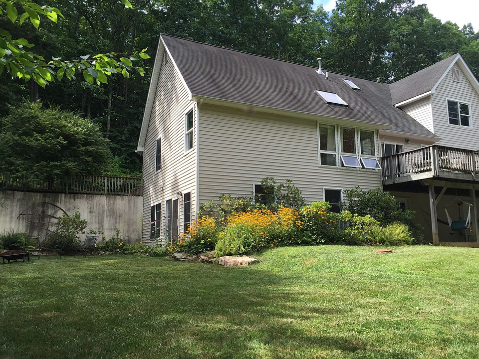 Beautiful contemporary design home on 2 private acres less than 10 miles to Blacksburg. Great natural light. Huge master on the main with gas fireplace, very nice master bath with jet tun and separate shower and HUGE walk in closet. Vaulted great room with a very efficient Pellet stove with dining area. Nice sun room that could also be a dining room or office space. Kitchen with gas stove and stainless appliances is open to living space. Laundry on main with outside access to huge back deck and lower deck. Another bedroom and full bath on main level with private/ public full bath. Upstairs are 2 nice size bedrooms and another full "Jack & Jill" bath. Lower level is another great finished living space (19' x 23'). Beautiful waterfall/ pond at front entrance. Very nice landscaping with flowers and berry bushes. Come experience the serenity of Spruce Run!
