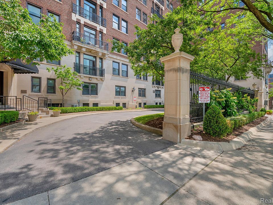 Welcome to a timeless 7th-floor residence in one of Detroit's most iconic buildings - the Albert Kahn-designed Garden Court Condominiums, built in 1917. This spacious 2-bedroom, 1-bath home blends historic charm with modern updates and jaw-dropping skyline views that stretch from Downtown to the riverfront. Inside, original architectural detailing is elevated by tall ceilings, rich moldings, and beautifully preserved hardwood floors. The grand living room centers around a classic fireplace and flows seamlessly into an oversized formal dining room - perfect for entertaining or quiet evenings in. Natural light pours in through oversized windows, framing sweeping views of the Detroit River and city skyline. The kitchen is thoughtfully updated with sleek cabinetry, stone countertops, stainless steel appliances, and a stylish tile backsplash, while the bath features vintage hex tile, pedestal sink, and soft natural light. Residents enjoy the rare benefit of in-unit laundry, a private balcony, and ample closet space, as well as access to a common rooftop deck and secure, gated parking (one space included; additional spaces available for rent). Storage unit included. This is a truly special rental opportunity - stately, light-filled, and centrally located just minutes from the RiverWalk, Belle Isle, and downtown's best dining and cultural destinations.