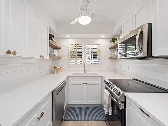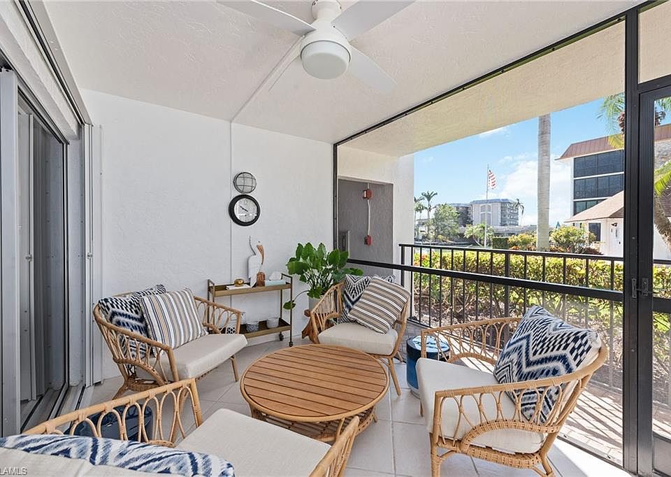 This beautifully renovated home boasts southern exposure, showcasing glistening views of Moorings Bay from the screened lanai. Ideally situated on the corner of Gulf Shore Blvd N and Harbour Dr, Bordeaux Club offers quick access to Moorings Beach Park, Moorings Golf and Country Club, and renowned shopping and dining in downtown Naples and Venetian Village. Alternatively, residents can walk across the street to enjoy the sandy beaches and vibrant sunsets Naples is famous for. Notable features include walk-in closets, plantation shutters, crown molding, and in-residence laundry facilities, making it move-in-ready while allowing for personal touches. The kitchen has been expanded to provide additional storage and features floating shelves, a shiplap backsplash, soft-close cabinets, and Samsung and GE appliances. Residents can also relax in the peaceful bayfront pool area, complete with a tiki hut, grills, BBQ area, fishing pier, bike storage, and a vehicle wash area. For those desiring a boat slip, an onsite slip can be purchased with quick Gulf access. This residence offers shutters for peace of mind, an exterior storage closet, and assigned parking. Enjoy the comfort of a well-run association, dedicated managers, and welcoming neighbors in your new home.