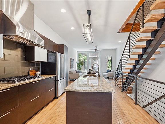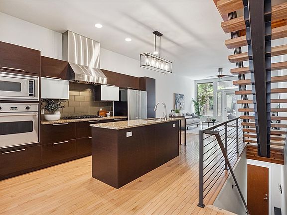 The main level is filled with natural light and includes hardwood floors, an open concept kitchen with granite countertops, built-in island, stainless steel Viking appliances and gas range. The main floor also features a half bath, dining room, and living area with pre-installed TV mount and private balcony access.