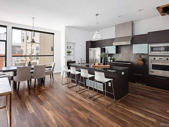 Experience elevated city living in this exceptional four-story townhome, perfectly situated in the heart of downtown—just steps from Coors Field, McGregor Square, and an array of restaurants, shops, and entertainment. Boasting skyline views from the rooftop deck and top-tier finishes, this home blends modern luxury with unbeatable urban convenience. Beautifully refreshed and move-in ready, this townhome feels like new without the full remodel price tag. The entry level features new flooring, a bedroom with a stylish 3/4 bath, and access to a private two-car garage. On the main level, brand-new walnut hardwood floors flow through an open-concept living space, illuminated by floor-to-ceiling windows. A double-sided gas fireplace adds warmth and elegance between the living and dining areas. The chef’s kitchen impresses with Viking appliances, a professional-grade vent hood, dark wood cabinetry with frosted glass accents, a sleek glass tile herringbone backsplash, granite countertops, and a spacious island—ideal for prep, dining, or entertaining. Step out to a private balcony with a gas line for BBQs. Upstairs, new carpet leads to two spacious bedrooms with en-suite baths. The primary suite includes a Juliet balcony, luxurious five-piece bath with soaking tub and walk-in shower, and a generous walk-in closet. The fourth-floor entertainment space is the crown jewel—featuring a built-in mini bar area and a sprawling Trex deck with stunning downtown views, perfect for sunset cocktails or gatherings. With high-end finishes, a thoughtfully designed layout, and a location surrounded by Denver’s top attractions, this townhome is an extraordinary opportunity for stylish city living.